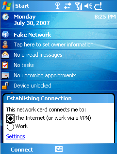 When finished, click the wireless icon at the top to reveal the Establish Connection screen. Chose "The Internet", and your phone will become connected through your PCs internet, as if it were a true mobile phone with data plan.